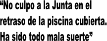 R.- No se trata de querer ser diplomático. Yo insisto, no culpo a nadie porque ha sido mala suerte. Si hubiese visto por parte de la Junta de Comunidades intención de paralizar el proyecto, lo diría. Hablo desde que yo soy alcalde, ojo. Desde entonces, han estado rápidos, preocupados y tan interesados como nosotros en poder inaugurar de una vez la ansiada piscina.