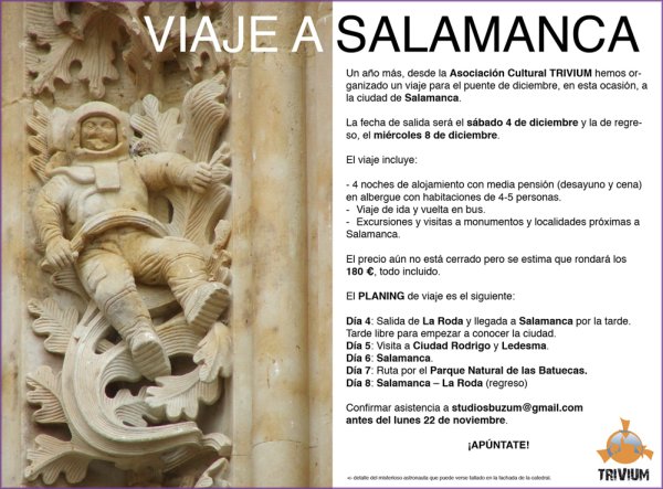CRÓNICA DE LA RODA.- La Asociación Cultural Trivium ha organizado, por sexto año consecutivo, un viaje para el próximo puente de diciembre. Esta vez el destino elegido ha sido la ciudad de Salamanca y alrededores. El precio del viaje ronda los 180 € -«no está cerrado», indican desde la Asociación- y está incluido el transporte en autobús, alojamiento en albergue en habitaciones de 4-5 personas, desayuno, cena, excursiones y visitas a monumentos y localidades próximas a Salamanca como Ciudad Rodrigo, Ledesma o el Parque Natural de las Batuecas.