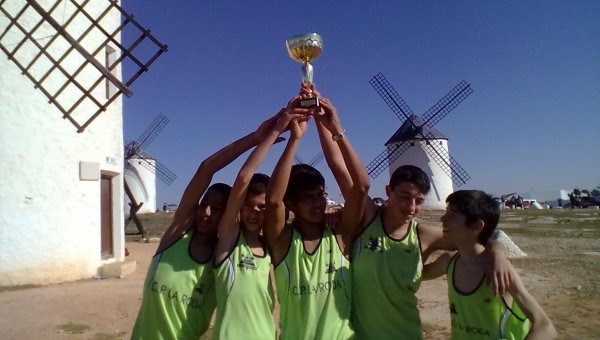 CRÓNICA DE LA RODA.- El equipo cadete masculino de la sección de atletismo del C.P. La Roda, formado por Constan Sincu, Álvaro Serrano, Jorge Castro, Mohamed Sadaoui y Mohamed Ouelhadj, se ha proclamado campeón regional de cross, lo que supone un hito en la historia reciente del club. Lo ha hecho en el Campeonato Regional de Campo a Través, celebrado el pasado domingo en Campo de Criptana (Ciudad Real).