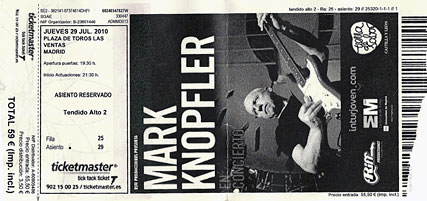Miren el precio de esta entrada: 59 euros. Dos horas raspadas de concierto, en el palo de la bandera. Repitan conmigo: 59 euros. Por esto a Mark Knopfler nadie lo acusa de ladrón ni de insolidario. Ver a Mark Knopfler en concierto es un lujo, como comer cocochas o irse de crucero: caro y prescindible. Pero si Knopfler vende su último disco a 15 o 18 euros y se queja de las descargas del eMule o de Megaupload es un ladrón y un insolidario porque tener los discos de Knopfler no es un lujo: es un derecho.