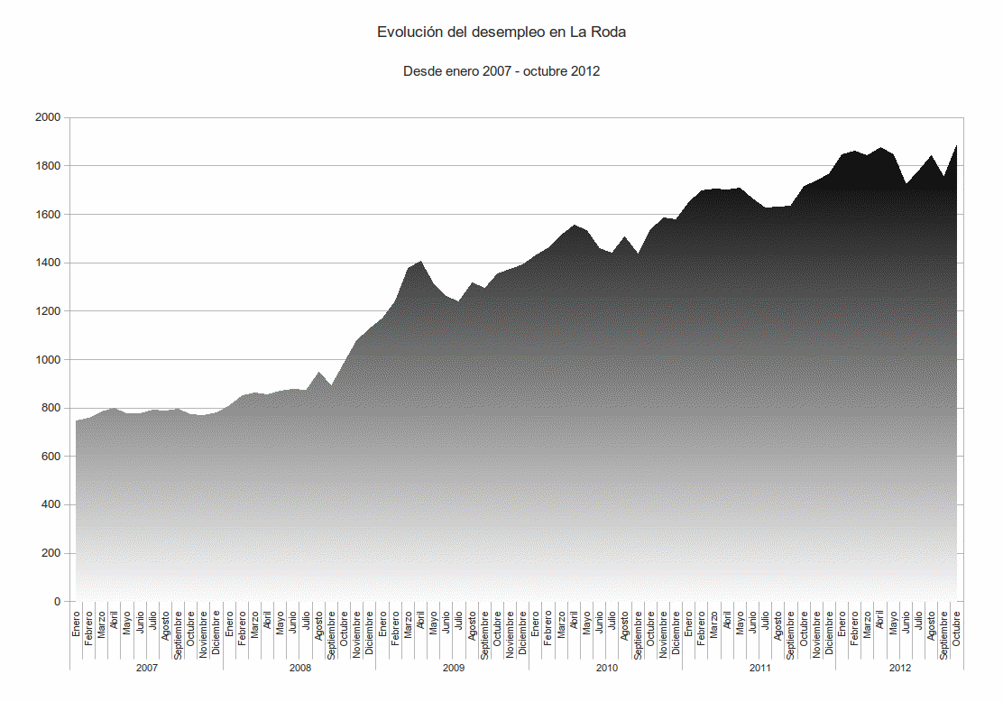 Los datos de octubre sitúan el número de rodenses parados en cotas desconocidas hasta ahora, superando incluso los malísimos datos de la pasada primavera (el anterior récord lo marcó abril con 1.875 parados). Entre octubre de 2011 y octubre de 2012, las listas de paro han engordado en 168 personas, lo que supone un aumento del 9,78%.