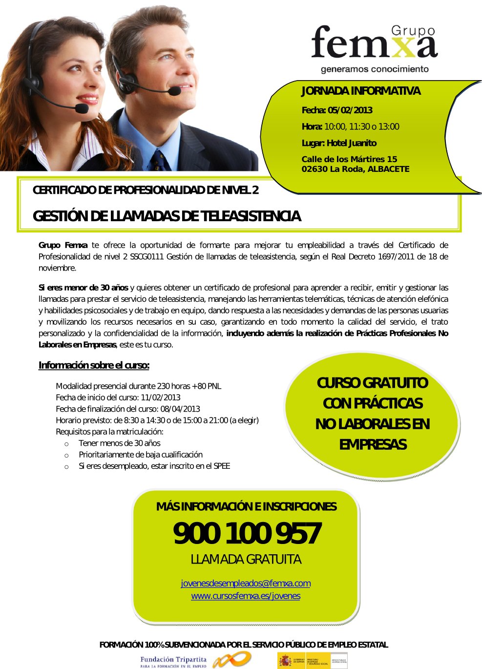 Los jóvenes rodenses menores de 30 años que se encuentren en situación de desempleo tienen una oportunidad. Entre el 11 de febrero y el 8 de abril tendrá lugar en las instalaciones de la autoescuela Paños de La Roda un curso totalmente gratuito de gestión de llamadas de teleasistencia, que incluye prácticas en empresas, y tras el que los alumnos obtendrán un certificado profesional. «Se trata de aprender a recibir, emitir y gestionar llamadas para prestar el servicio de teleasistencia, manejando las herramientas telemáticas, técnicas de atención telefónica y habilidades psicolosciales y de trabajo en equipo, con el objetivo de garantizar la calidad del servicio, un trato personalizado y la confidencialidad de la información», asegura el grupo Femxa, organizador de este ciclo formativo que está subvencionado por el Servicio Público de Empleo Estatal.