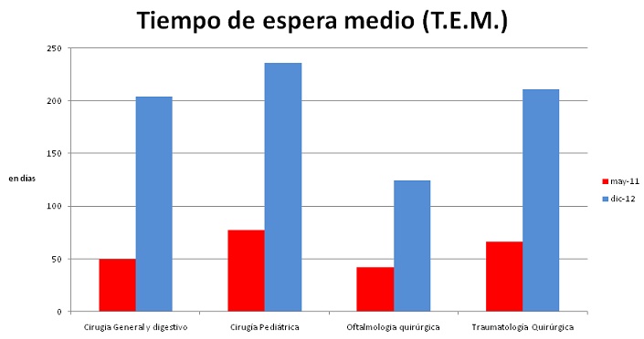 Tanto es así que, según datos del propio SESCAM, en mayo de 2011 había 1.036 personas en lista de espera para una intervención quirúrgica traumatológica mientras que en diciembre de 2012 (últimos datos disponibles) un total de 3.760 personas estaban esperando a ser intervenidas. En este sentido, son ya más de 2.000 personas las que llevan esperando más de 3 meses para ser intervenidas en cirugía traumatológica.