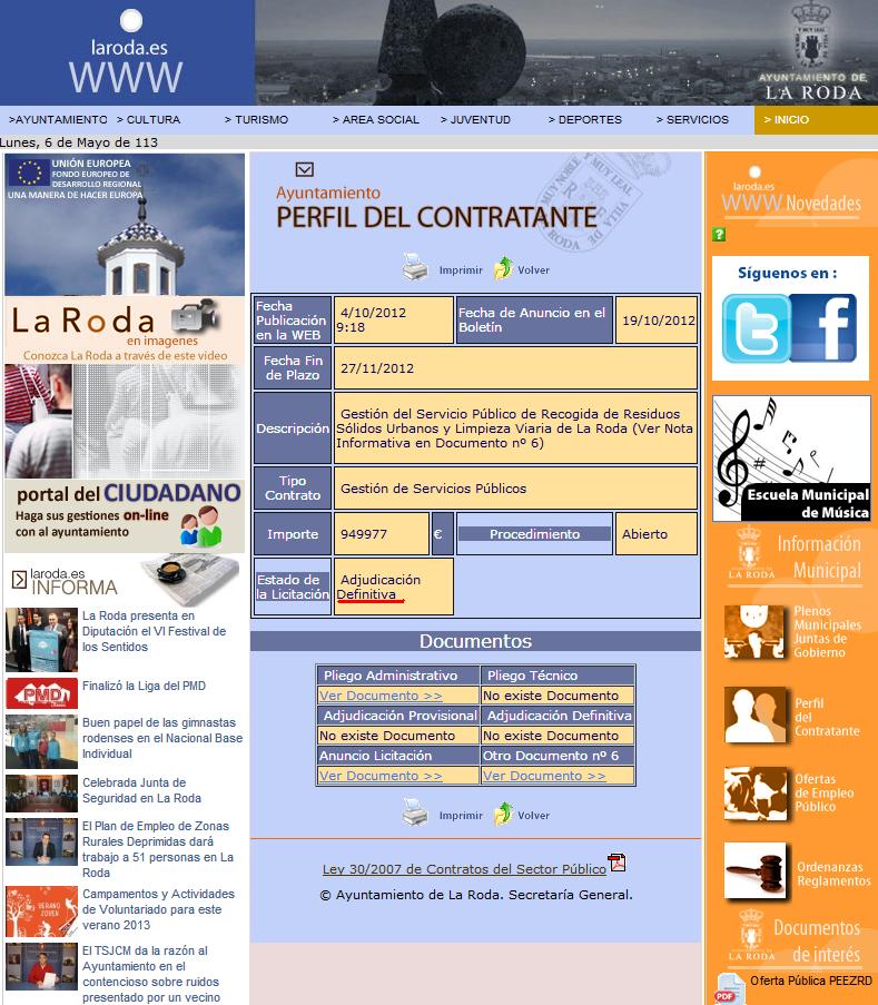 Esas dos palabras, inicial o provisional, se repiten cada vez que un concejal se refiere al asunto, en público o en privado. Lo cierto, sin embargo, es que el proceso de adjudicación a Fobesa se había completado de manera definitiva, tal y como recoge la web del Ayuntamiento en la imagen que pueden ver abajo.