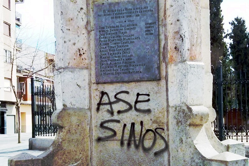 Que alguna de las cientos de personas que vinieron a La Roda en las llamadas marchas de la dignidad hiciera una pintada en el Monolito no está bien. Decimos alguna, porque no creemos que estuvieran cien mirando y una pintando; más: ni siquiera sabemos si quien lo hizo era de fuera, aunque todo apunta a que sí, y a que tiene serios problemas de comprensión lectora, de conocimientos de historia y de educación.