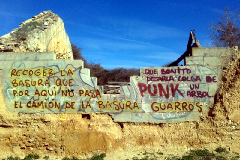 Me ha gustado el grafiti que ilustra este artículo y que adorna una de las derruidas paredes de una casa cercana al puente de madera. Por lo general, no soy partidario de este tipo de pintadas, sobre todo cuando se realizan sin arte ni sentido, más por vandalismo que por otro motivo, aunque según en qué lugares y circunstancias son apropiados, y en esta lo es. Sobre todo si sirve de aviso a todos aquellos que dejan allí las bolsas de basura con la inútil esperanza de que alguien las recoja. A lo mejor es simple ignorancia y realmente piensan que existe un servicio de recogida de desperdicios en el lugar.