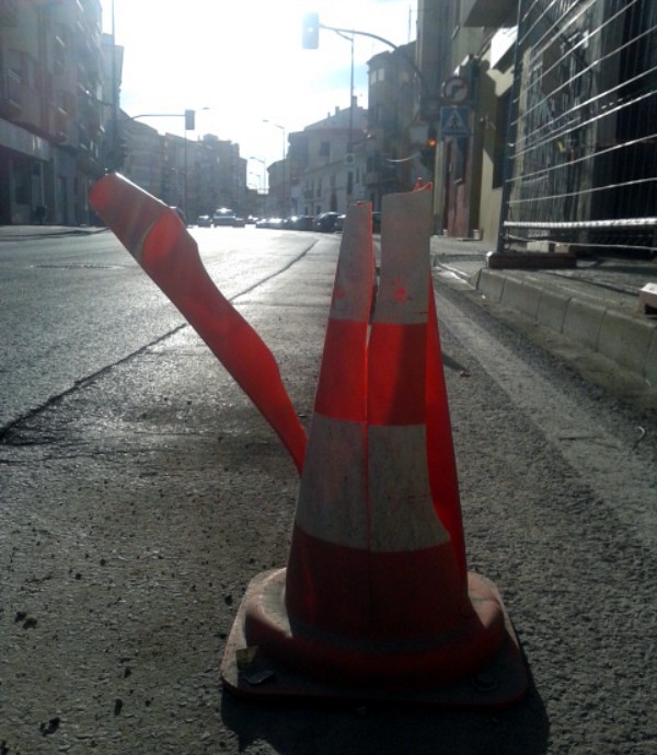 Según mis cálculos, ya son más de seis meses los que han transcurrido desde que me colocaron junto con otros compañeros a lo largo de una fachada en ruinas de la calle Alfredo Atienza, a la altura del número 25, acompañando a unas deslucidas vallas metálicas. Yo no he sido mucho de quejarme, sé en qué consiste mi trabajo, pero son ya más de ciento ochenta días los que malvivimos a la orilla de una de las arterias más concurridas de la localidad, y no exageraría si dijera que la que más. ¿Es tolerable que se someta a tan vil tortura a un inocente cono? A lo largo del día son cientos los vehículos que circulan por dicho lugar, y a la vista de nuestro aspecto actual podéis deducir que han sido muchos los vehículos que nos han golpeado impunemente, pues ninguna ley ampara nuestra integridad física.
