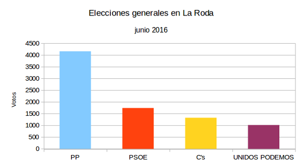 El Partido Popular ha arrasado en La Roda en las elecciones generales celebradas este 26 de junio. Los populares logran 4.158 votos, el 49,67% del total, lo que supone un incremento de 179 votos. Muy lejos queda como segunda fuerza el PSOE, con apenas 1.742 papeletas (20,81%), 269 menos que el 20-D. En tercer lugar se sitúa Ciudadanos, con 1.327 votos (111 menos que en diciembre) y por último Unidos Podemos, con 1.018 votos (172 menos de los que Podemos e IU lograron por separado en la anterior cita con las urnas). La participación se ha situado en el 73,7%, 4 puntos menos que en diciembre.