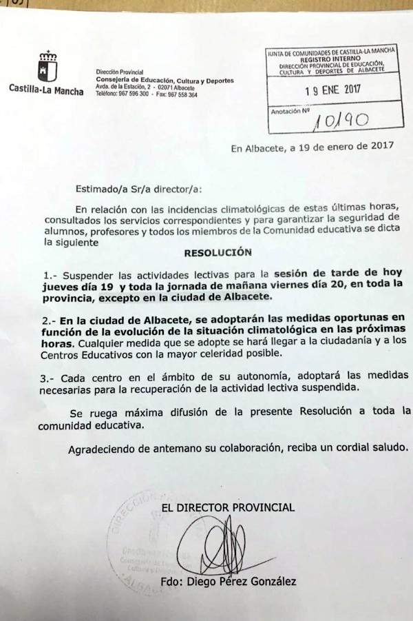 La Consejería de Educación de la Junta de Comunidades de Castilla-La Mancha ha decidido suspender todas las actividades lectivas previstas para la tarde de este jueves y para todo el viernes día 20 de enero en toda la provincia de Albacete –a excepción de la capital- debido al temporal de frío y nieve que azota la zona.