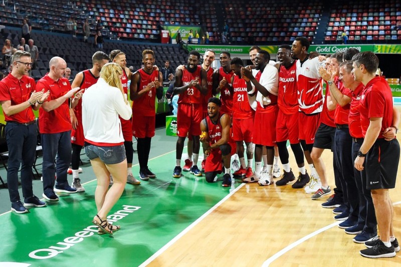 El jugador del FG La Roda, Jamell Anderson, acaba de pedir matrimonio a su pareja, la jugadora inglesa Georgia Jones, después del partido que el combinado inglés disputó ante Camerún, con victoria para Inglaterra (54-81).